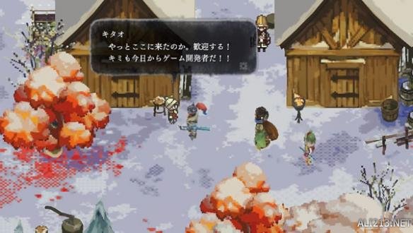 中に入るとファミコン風のドット映像とBGMが流れ、村の人々も人間だったりモンスターだったり様々。