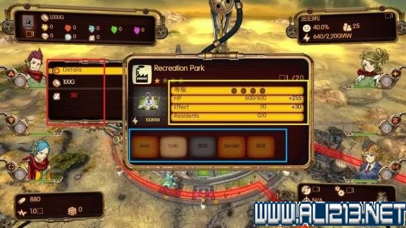 蓝框则是建筑操作项目,从左到右是事件、升级、附加功能、摧毁和移动位置。
