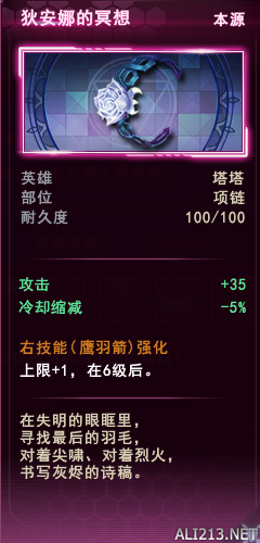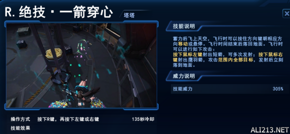 绝技 一箭穿心 塔塔的终极大招 也是非常有特点的大招 无尽中少数可以飞天的技能 持续15秒 有高空视野 并且系统会把被墙挡住视野的敌方英雄以脚下红色瞄准来给你标明位置 期间可以左键普攻并且附带落地爆炸效果 右键则是放出一发威力极大的爆炸箭 范围还行 在后期如果防具不出血防 一个满血脆皮是吃不下一个塔塔大招右键的