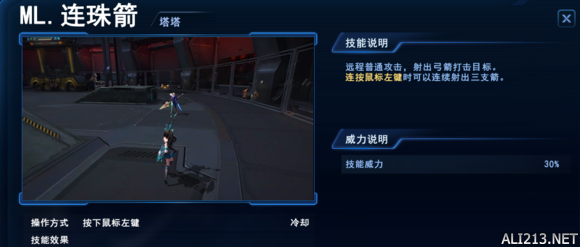 连珠箭 比较常见的远程ML攻击的模式 可以单发也可以三连发 缺点是每发威力较短 但是三连发的硬直效果可以穿插在塔塔所有技能中以补足硬直和伤害的空档 MR技能
