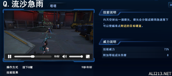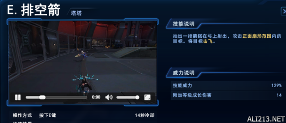 从图中可以看见E技能一共5只箭 第一箭会造成技能说明的伤害 其他箭命中同一敌人以第一只箭的15%左右来计算 虽说是贴脸伤害对塔塔实用性不高 但是利用这点刷小兵和精英怪会事半功倍 还有一点是E技能不能穿透 也就是英雄面前小兵会挡住箭所以释放E技能击杀敌方要找准位置不让小兵或其他敌方英雄挡住(这不是废话么(╯‵□′)╯︵┻━┻) 由于这个技能是击倒特性 所以在队友对别人进行连击或者刚开始对一名敌方进行集火时不要第一时间使用 不然送给对面倒地保护起身F了你队友那就尴尬了 ML技能