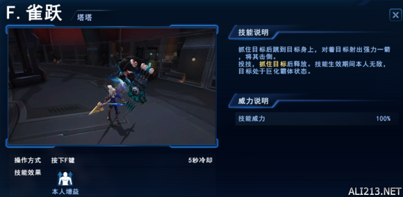 雀跃 所有英雄都有的近身抓取技 塔塔的F效果则是将敌方击退一段距离并击倒 自身向后退 对于一个脆皮来说是一个很不错的保命技能 然而需要注意的是这个技能是将敌方击倒 所以最好不要在F之后马上接技能反打 这样可能容易被敌方起身保护+霸体突进再次切中 SP(空格)技能