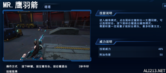 鹰羽箭 塔塔的核心技能!!!让很多人觉得塔塔恶心的地方 这个技能就是保证塔塔在现在依旧是排位热门的一大原因之一 超远视距外打击 较高的硬直 较高的伤害 多达5(6发的储存箭数 无论是开局抢对面的黄点还是前期对线消耗都十分强 可以超远距离配合来gank的队友补足硬直和伤害来击杀敌方 然而到了后期 装备成型后高伤害的效果显而易见 对前排的威胁也开始特别高 5箭点残前排 打中后排一下就是一大管血 关键是你还找不到塔塔在哪! 在没有对面前排干扰如果先手MR射中对面脆皮 不开一些前摇短一点的逃生技能 极有可能被4箭或者5箭全中带走 F技能