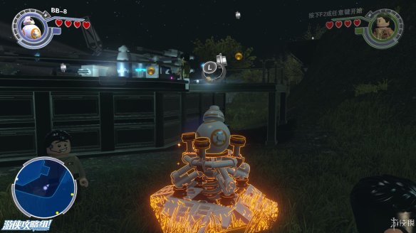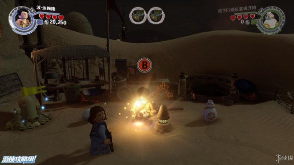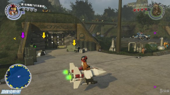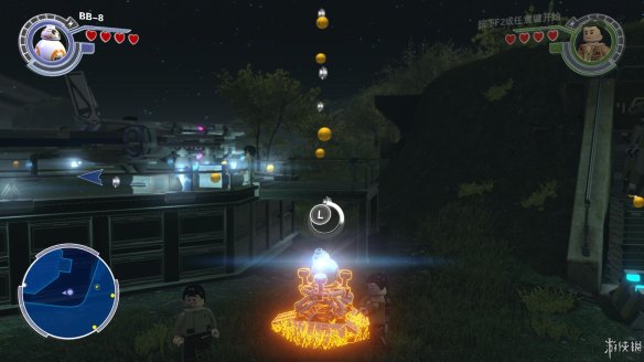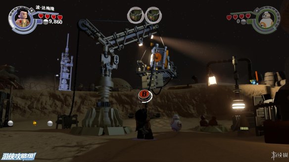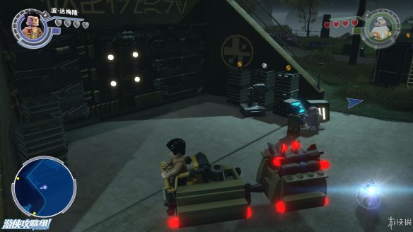 Part1:起飞之前,可以在基地周围逛逛,能收集不少点数,也能找到不少好玩的。在波要驾驶的飞机前,一名抵抗工作者不慎失误,导致楼梯被毁,好在还有积木可以使用。先向右边搭建积木之后,在平台上破坏积木,可以上升到一定高度,空中存在隐藏道具。向左则可以搭建BB8的平台,可以让其跳到上面平台,解开一个密码后,波可以用绳子达到上方平台,然后出发。