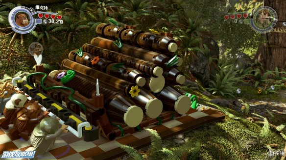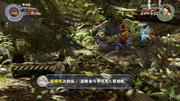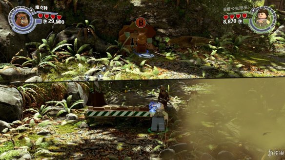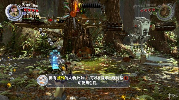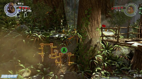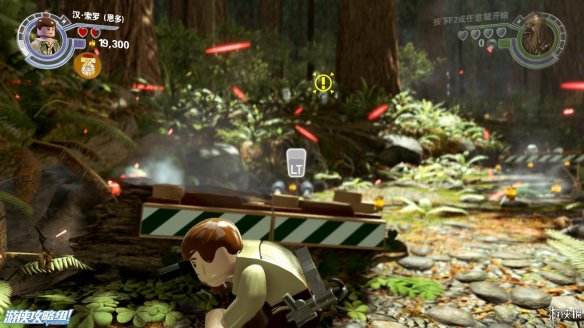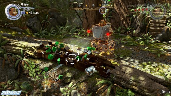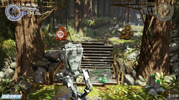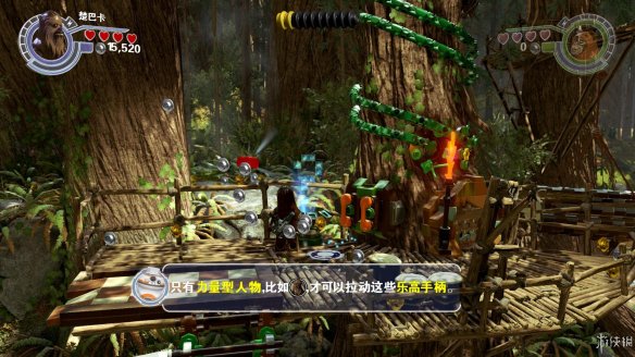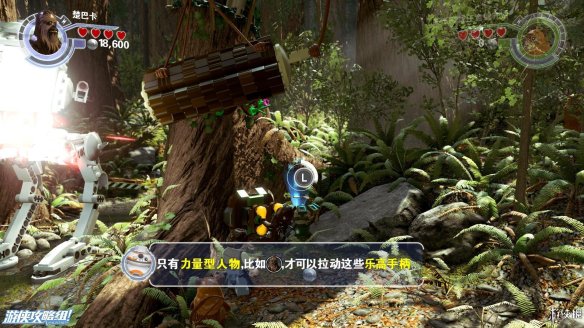 Part2:维克特可以进入较小的空间,爬进树洞后向左推下箱子,散架之后可以作为向左侧搭积木的材料,从左侧上去后可以获得红色积木一个。向右侧搭积木让楚巴卡上去之后可以拉动乐高手柄,机器人右侧还有一个手柄,拉开后中间机器人被破坏。