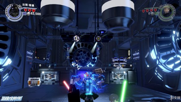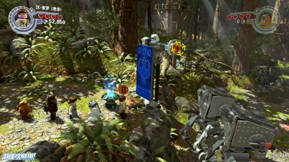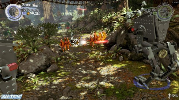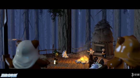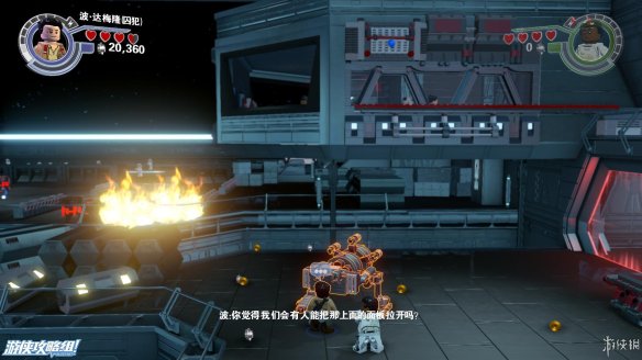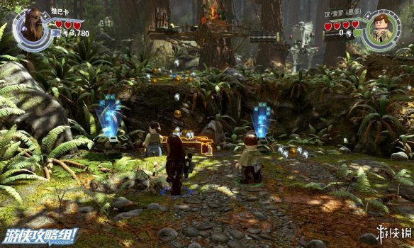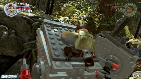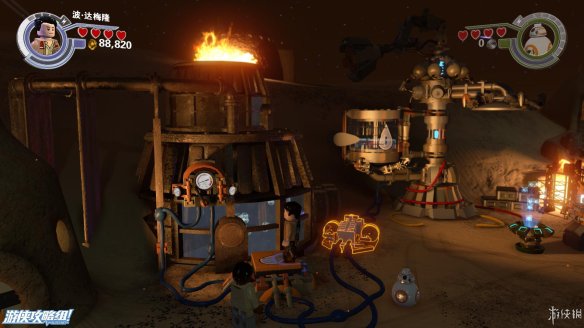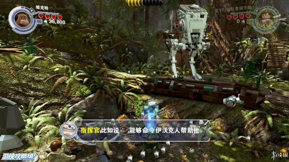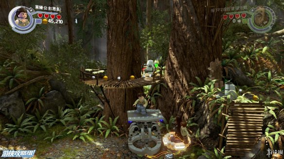 Part4:在路的镜头用维克特命令人物小队帮助他,可以推动上方木材堆让下方机器人滑倒,然后利用机器人散落的材料现在左边搭积木可以造出强力武器,炸开路障,救出卡在里面的R2-D2,再搭建斜坡让R2-D2也可以上去。之后在右侧搭建出控制台,用R2-D2解开机关,可以让平台上下移动。在这之前可以先在中间搭建到达高处获得乐高积木。