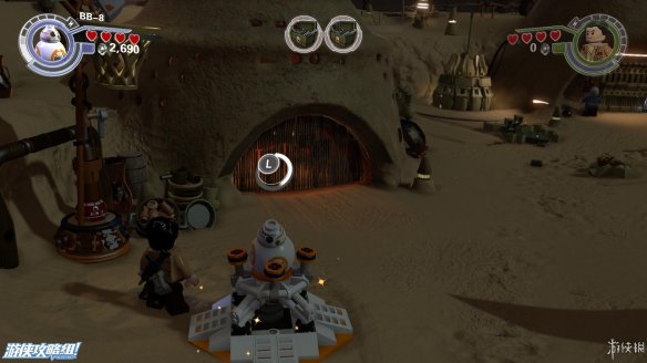第二个武器库,先用BB8给发电机充能,然后进入房间之后,可以用积木搭出武器箱,然后它自己晃晃悠悠就出去了,倒在了地上。武器箱出去之后不要着急,可以在房间内直接拼出一个微型工具箱。在下面这个位置可以帮助村民搭建敌人样子的玩偶,待其分别击落后,可在左侧棚子上方获得红色积木。在部分地点可以帮村民搭一个藏身的桶,搭好之后他会自己钻进去。