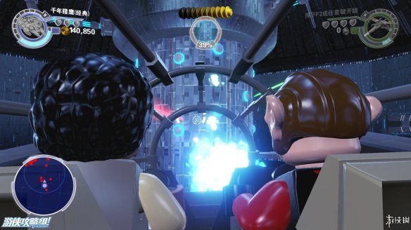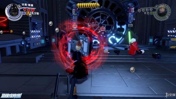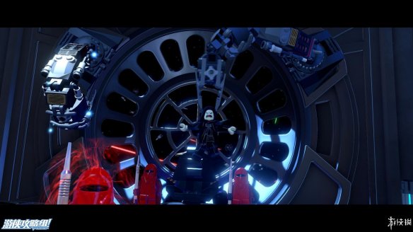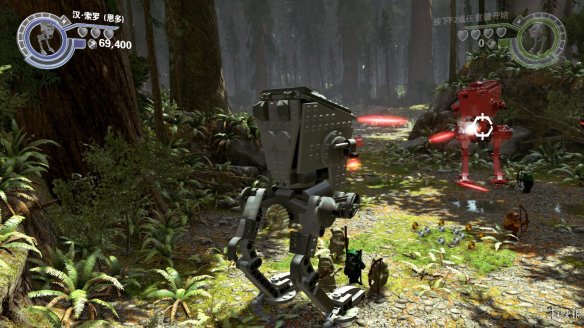 Part5:利用汉•索罗的绳子,拉到上方高处到达机器人头部,在合适的时机互动,可以占领机器人,共有两台机器人可在多人游戏中利用。控制机器人时不能边走边攻击,并且无法攻击太近的目标,在机器人上可以直接踩死敌人,但是不会掉落增加点数的纽扣。桥的位置需要把两侧的重物击落。到达堡垒前,可以破坏场景中的三个金色物体,会得到隐藏物品。然后前往触发剧情,敌人数量已经不如我方,只好缴械投降。