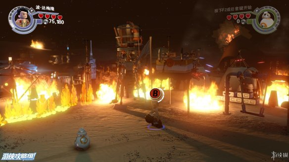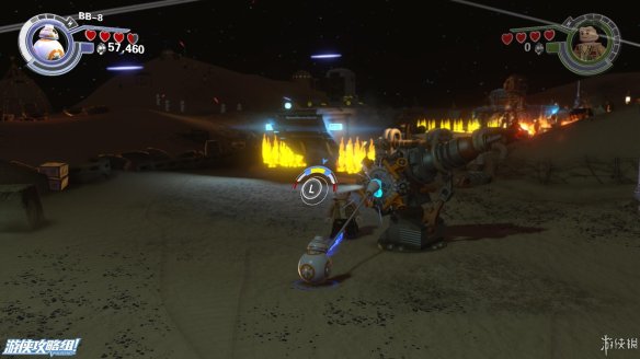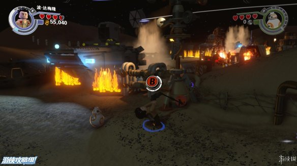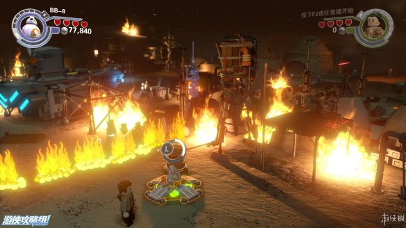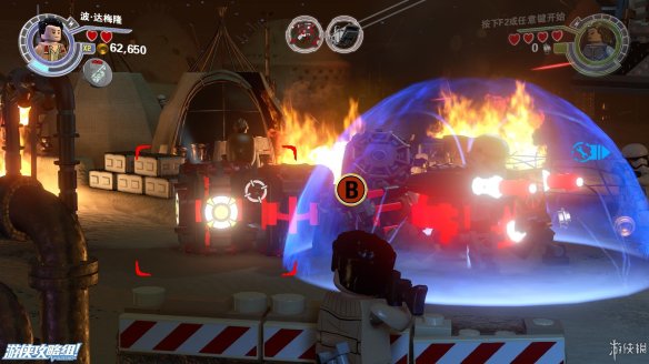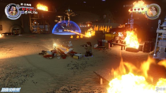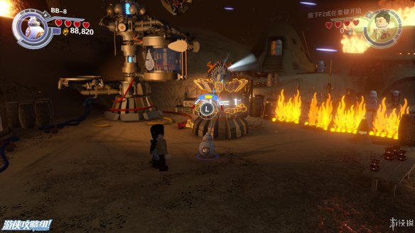 Part5:圆形喷火的敌人还有护盾的保护,需要将边上的积木打散,重新拼成一个螃蟹型机器人,会从地下钻过去攻击敌人。来到需要灭火的地方。中间的积木先向左,连接断了的水管,然后踩到左侧浮板上,等水全部充满后面的容器之后,往中间搭建控制台,让容器转移到另外一边,最后向右搭建形成完整电机,用BB8充能即可出水灭火。