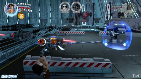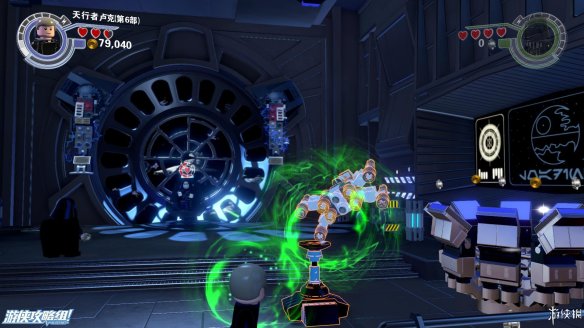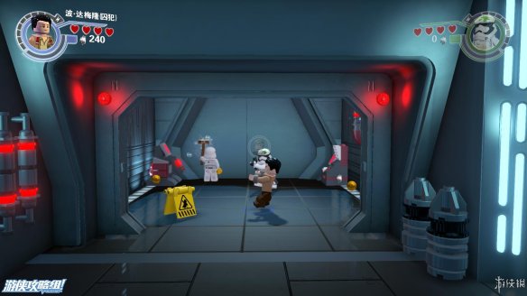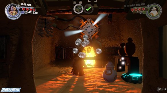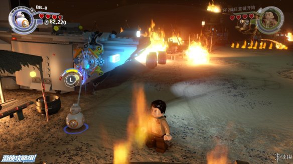 Part4:打败这些敌人之后,下面的路被封死,用波拉下一堆积木,向右侧可以给BB8搭一个秋千,可以上去玩一会。向左搭一个控制台,BB8解开相关障碍,然后下一区域还出一些敌人,击败之后,还是先波在BB8的顺序解开下一个机关。一个飞船残骸处用BB8充能打开舱门可以获得微型工具箱。