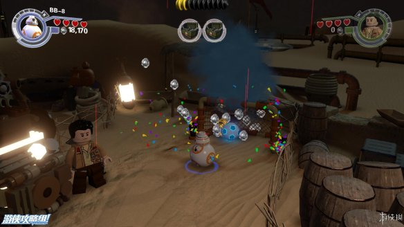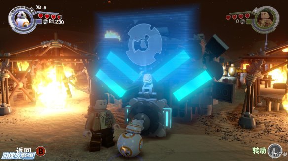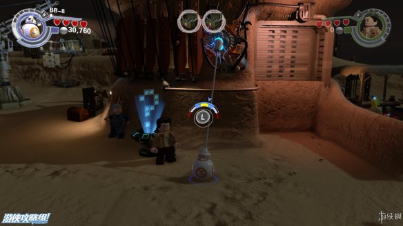 Part2:波和洛尔正在交谈,这时候第一秩序的军队却出现了,波必须离开,而洛尔也必须藏起来。普通民众这时候也纷纷拿起武器准备自卫。这个地区的首要目的是解锁两个武器库,让大家都能拿到武器。在小镇子里面,可以和BB8一起投篮,踢足球,骑小玩具等,第一次踢足球还可以获得隐藏道具。在发现提示的地方使用望远镜,锁定目标后,可用绳子拽下,可在两个方向上搭建积木。先右,让BB8发射到左侧雨棚上方,然后向左,可以搭出控制塔吊的操作杆,然后BB8解密,可以让门口的电机运作起来,进们以后用BB8给机器充能,就可以打开第一个武器库。