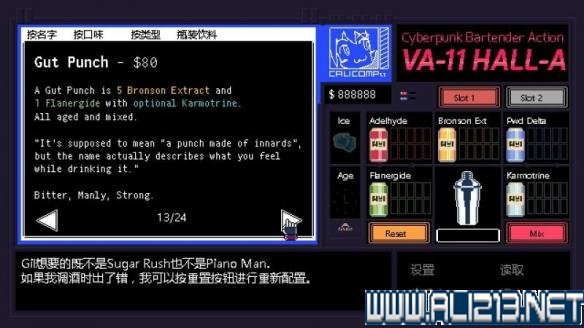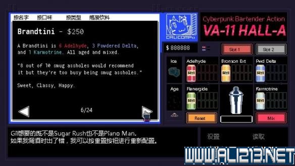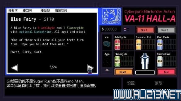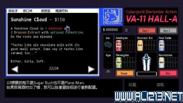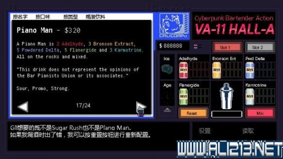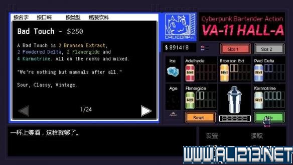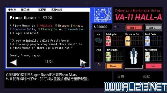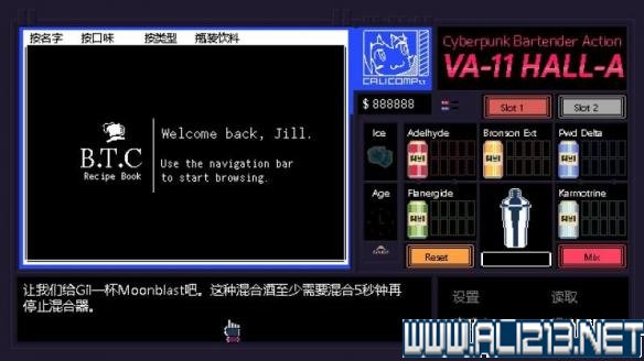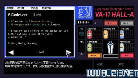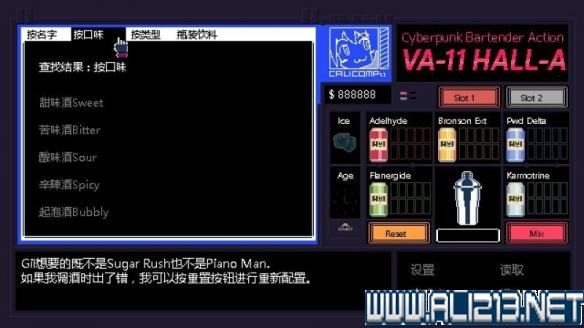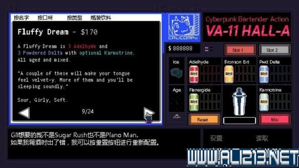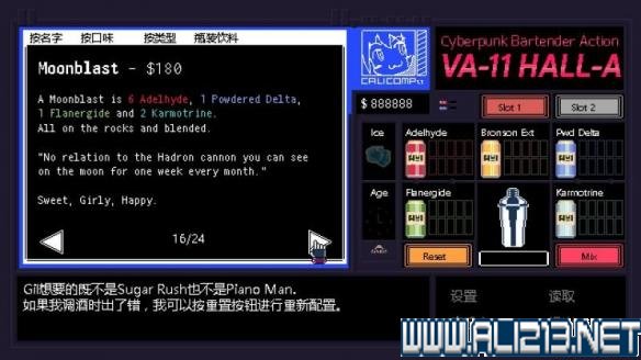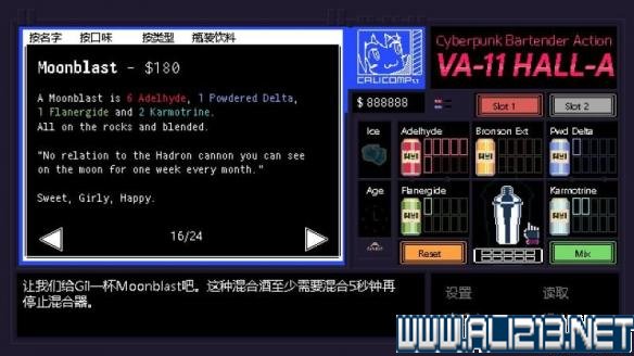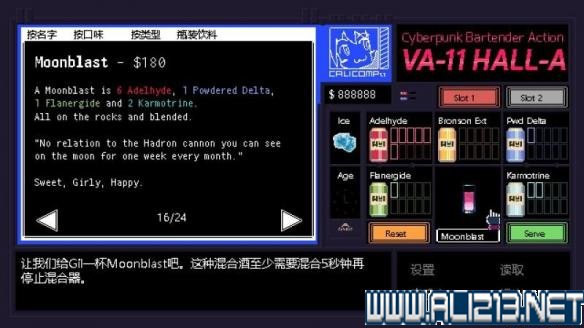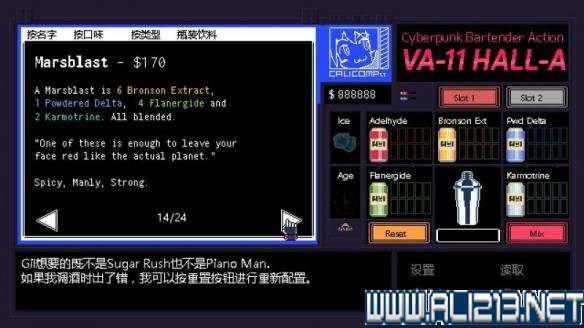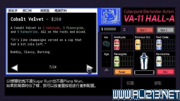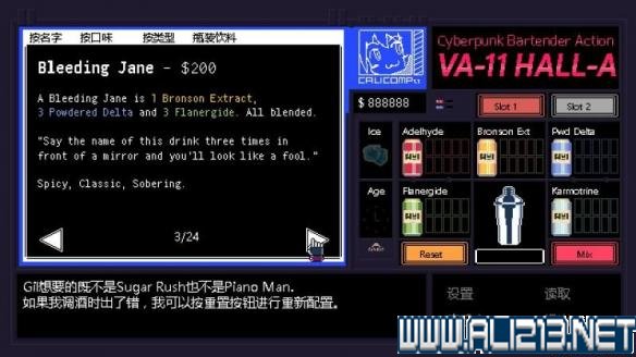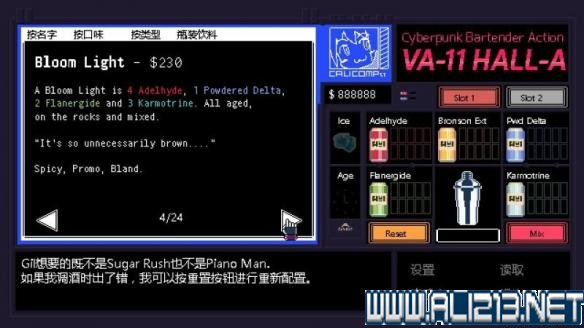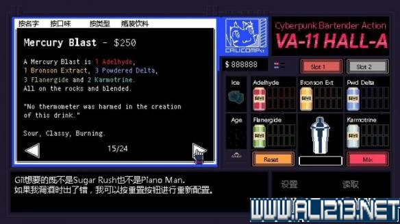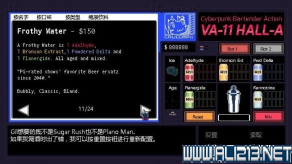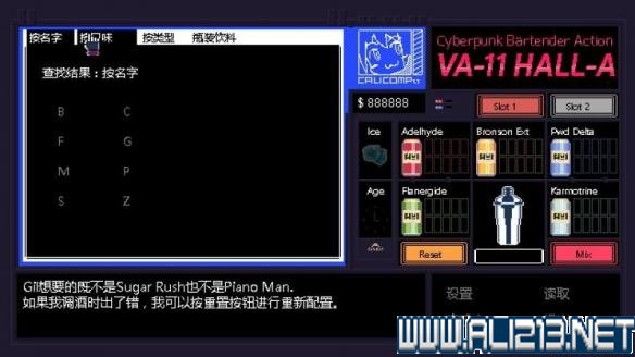 调配框:屏幕右侧为调配框,当中会显示五种调酒材料(adaelhyde、bronson ext、pwd delta、flanergide、karmotrine)、两种添加物(冰块、age)、两个槽(1槽、2槽)以及两个操作键(重置和混合)。