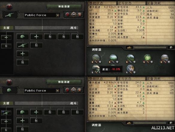 如果要详细讨论最佳搭配的问题,估计单独开贴都说不完,所以这里只讨论如果我在部队里增设一组火炮,该放支援位还是放战斗位?37年初的卢森堡,要陆军经验没经验,要装备没装备,所以只能在这两种屌丝阵容里选了。让我们先看看对比图: