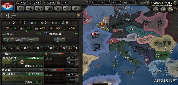 5.生产方面:请保证资源供给充足。产能是个很有趣的东西,很多新手喜欢作弊,提高数倍产能,却没发现库存浪费掉的,往往远多于这个比例。毕竟产能合理利用的情况下36年卢森堡这种小破国家都够用了。当你抱怨这游戏太难的时候,看看生产线,资源够不够军工厂马力全开?看看剩余人力,有多少后备力量在打酱油?看看库存装备,有多少装备在吃灰?
