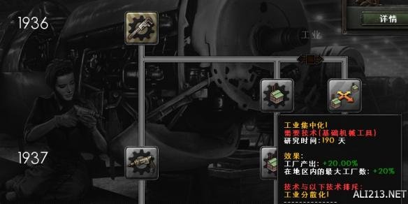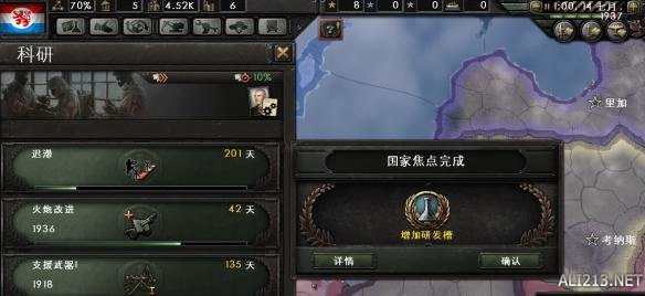 第一个国家焦点研究完毕,游戏会自动暂停。接下来的焦点选择“军队发展”过度。国家焦点的真正方向是:工业化发展-民业发展1-民业发展2-基础设施1-基础设施2-增加研发槽。但是“工业化发展”送了一次50%的工业研究奖励。这和我的科研冲突:接下来我会研究工业集中化1-工业集中化 2(1937年科技,超前有惩罚)。如果70天后焦点完成,获得50%的buff,需要当前科技剩余(73天)+工业化1(0.5*190)=160天,继续研发工业集中化2时会有3个月的超前惩罚。