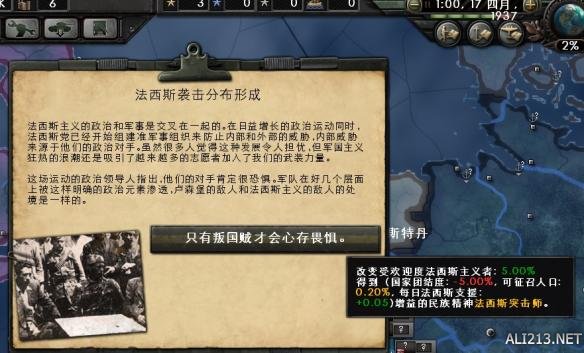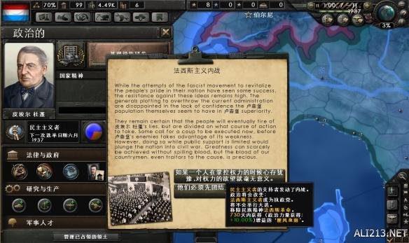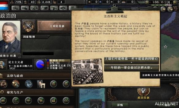 70天获得70点政治力量加上焦点送的120点合计190点。选择一个政治顾问。共产主义+0.1和极端民族主义(法*西*斯)+0.1均可。游戏设定全球紧张度低的时候,民主主义国家是不能伪造宣称和宣战的,所以需要变换政体。这里我选择极端民族主义,出了个事件,不知道两个选项有什么区别,选了个听上去高大上的(年轻一辈将会接过火把)。