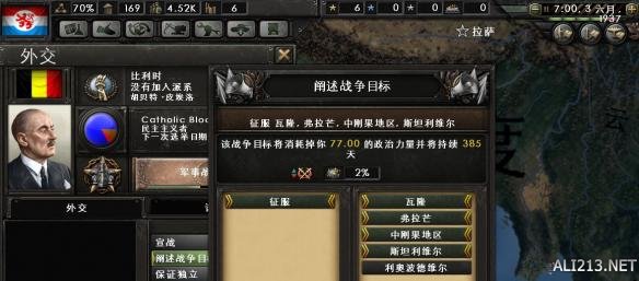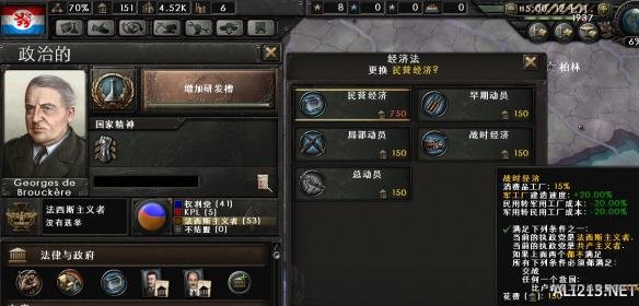 上台后第一件事当然是对外传播我们新的理念(对外扩张)。选择制造造比利时的战争理由。理由选多少,由国家的备战状况决定。目前状况下,减去造宣称消耗的政治力量,转换强制兵役(450)+战时经济(150)还差500点政治力量(需要约10个月),训练部队需要4个月。所以这里造385天的借口。