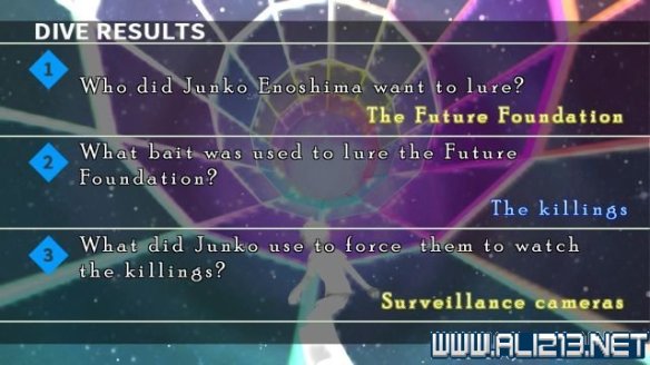问题三,江之岛盾子用什么查看杀戮过程?答案是“(红or黄or蓝)摄像机”。