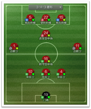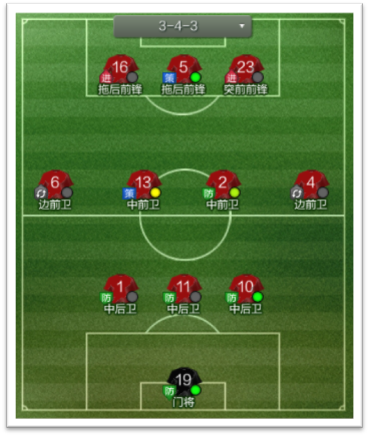 经典的3-4-3演变出的3-4-3菱形阵型,后防线上,我认为3-4-3强调的是少失球,而不是不失球。所以,总是让一名身体素质优秀、头球好的中后卫拖后,充当清道夫;2个边路则用一个防守能力出色和一个助攻能力出色的后卫来协助中后卫协防,并适当地运用越位战术,来对付对方的突破……