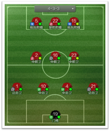 优点:最为激进的一种打法,将注意力全部集中在前场,三名前锋在数量上本身就多,加上中场的两名前腰的配合,经常打出大比分。
