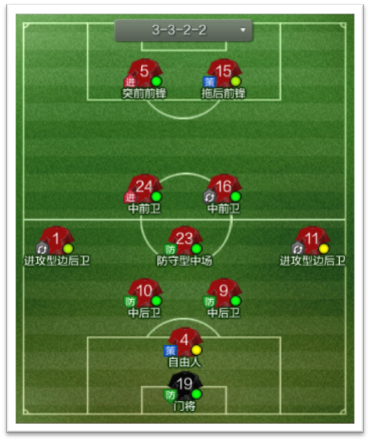 3-2-2 这个阵型只有在生死关头才能放手一博,所以不能常用,只有到了必须豁出去的时候才能采用。后卫线上只有3名后卫,中场也只有一名后腰,防守肯定会有非常吃紧。其次,左右边后卫需要积极压上助攻,因为这样才能给前场的4名攻击手以足够的支持。这个阵型最关键的就是后腰。需要有很强的防守能力。
