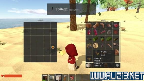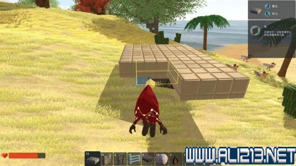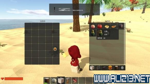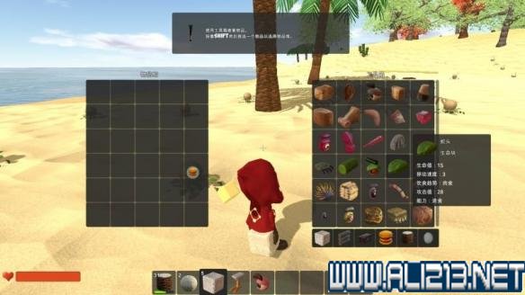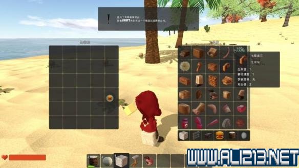 工具箱:这里摆放的是玩家的道具的存货,总共分类6个类别,肉、墙体、家具、食品、植物。