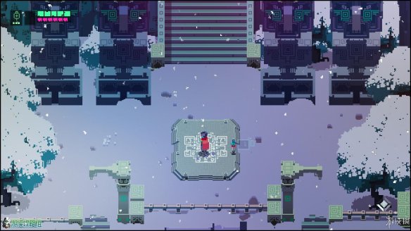 战斗完毕后顺着台阶往上,可以看到一块在城镇中也能看到的二维码(误)平台,站在平台上按互动键可以恢复血量跟子弹,同时还可以打开地图进行传送。
