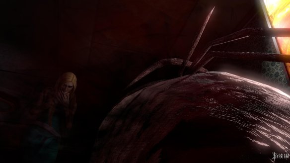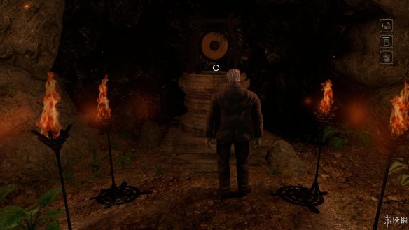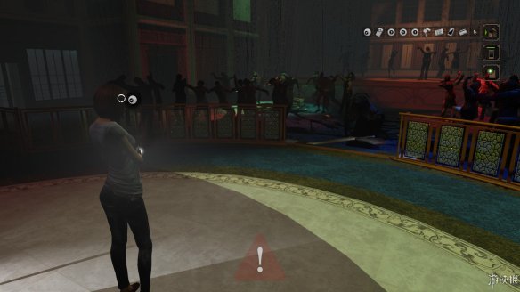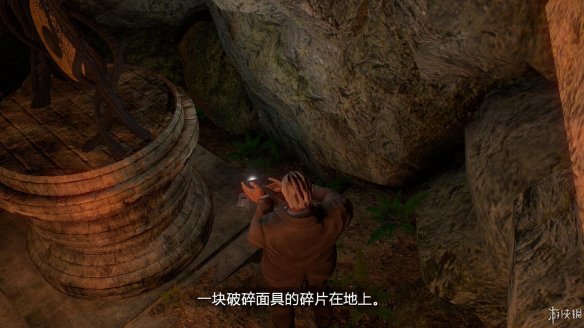 出去后再回到第一个分叉口往左走,注意道路中有一个看守的面具人,要绕过他的灯光,走到左边尽头发现一个铜锣,调查得知似乎可以利用这个来引开守卫。在铜锣右边的墙壁上两次调查能够收集到掉落在地面上的碎裂面具。