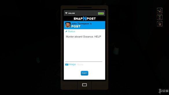 现在右上角物品栏下方多出了两个图标,一个用来打开手机,一个用来点亮手机的灯。首先打开手机点击POST,可以发一条求救的信息。