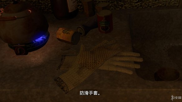 从前方房子的木门进去。房间内水壶旁有一双防滑手套,收集起来。