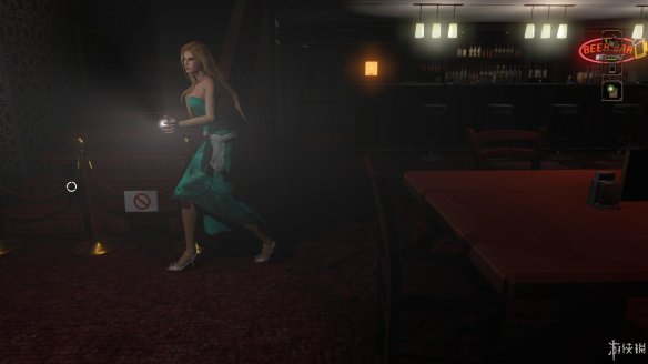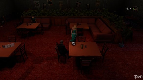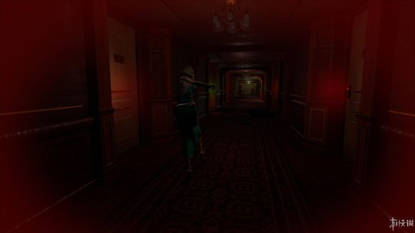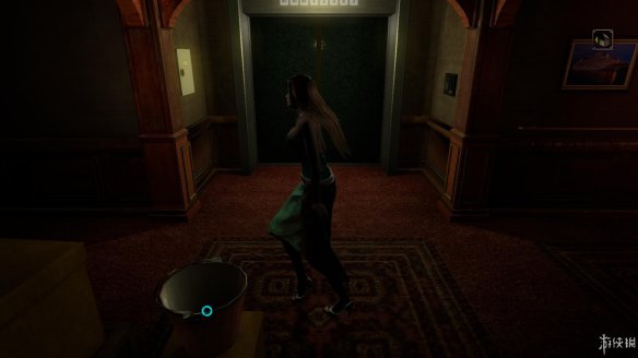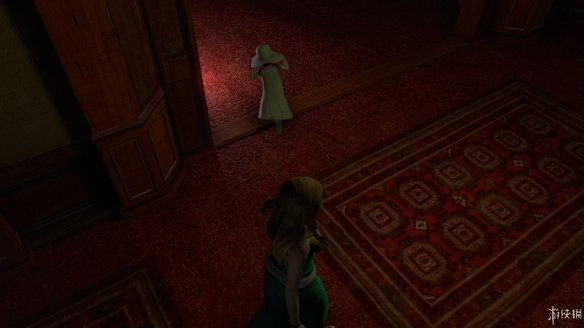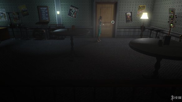 去查看咖啡厅吧台旁边的楼梯,调查后发现这是通向2楼的入口,2楼上方的绿门后是漆黑的一片,到楼上后最好开着灯进去,防止剧情杀。