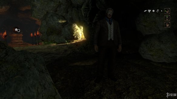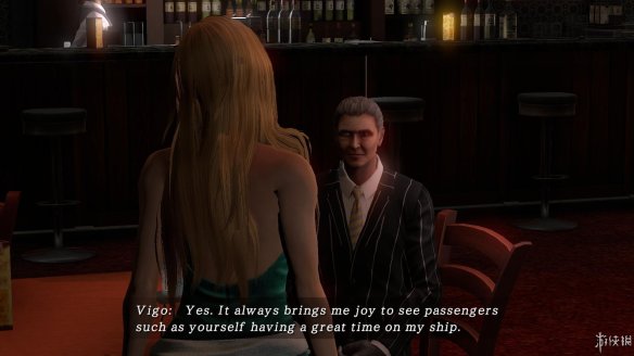 2,沿着道路来到咖啡厅,和座位上的一位中年男士对话,独眼的中年男士告诉你他是这艘游轮的主人,希望你在游轮上玩的愉快,继续对话,他会告诉你物品栏的使用方法,并且有一个小小的请求,希望你找来火柴为他的义眼消毒。
