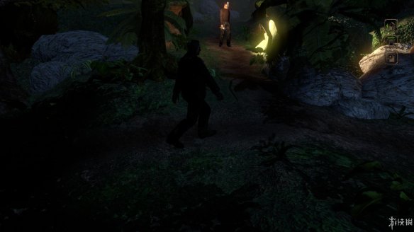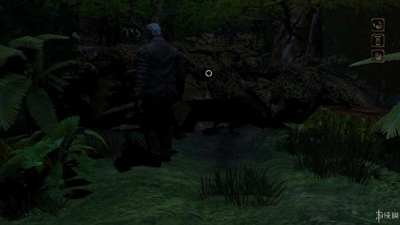 4,穿过灌木丛后往前会看到一个看守的面具男,别被他的手电筒照射到,选择往右边的道路前行。