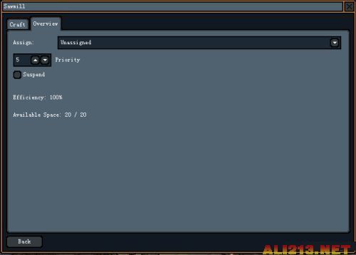 工作坊还有一个Overview的信息界面,可以设定该工作坊由某个矮人专门值守。以及优先级、暂停使用、效率和自带存放空间。