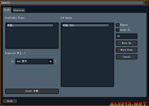 建设好工作坊以后,打开界面,你可以设定工作任务。为了形成自动化的供应链,建议直接设定保证需求选项,并输入需求量。这里设定为20。你也可以设定为Repeat,这样只要有圆木就直接加工为木材了。不过不推荐这样做,因为圆木还可以用来烧制木炭,制作火把。Move Up和Move Down可以设定任务优先级。