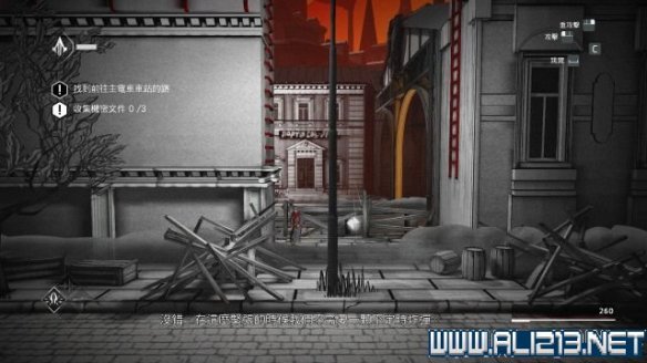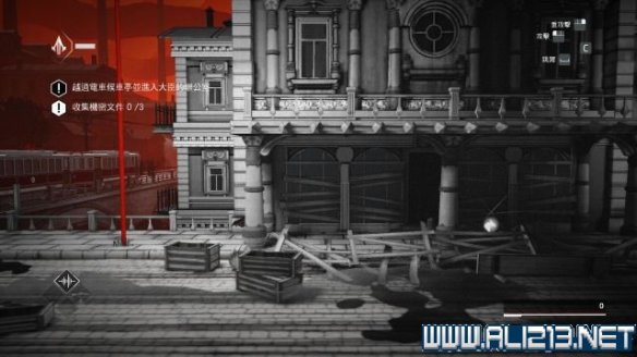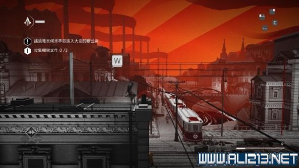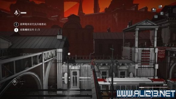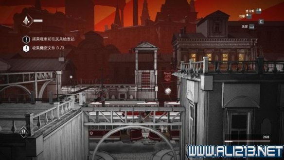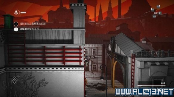随后借助桥底左侧的梯子将携带秘密文件的守卫暗杀掉(按V键使用鹰眼找出),然后将他的尸体抬到左侧的轻轨旁,从其身上可以搜刮出秘密文件(次要目标2/3)。