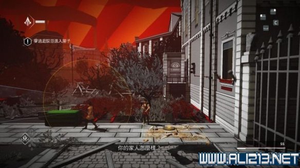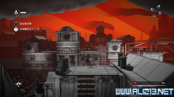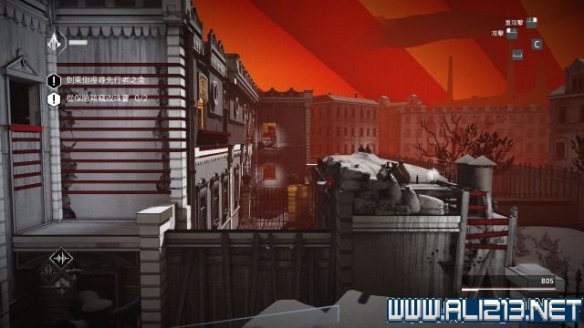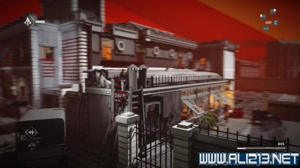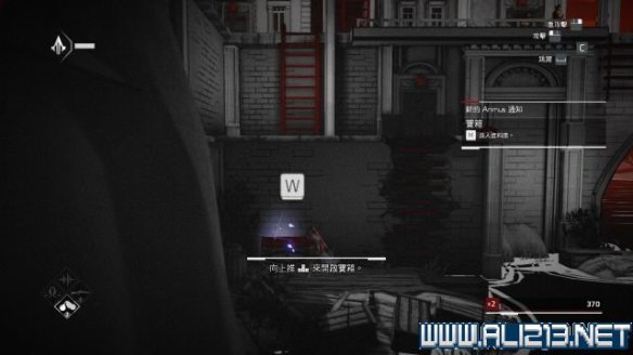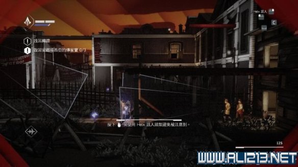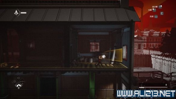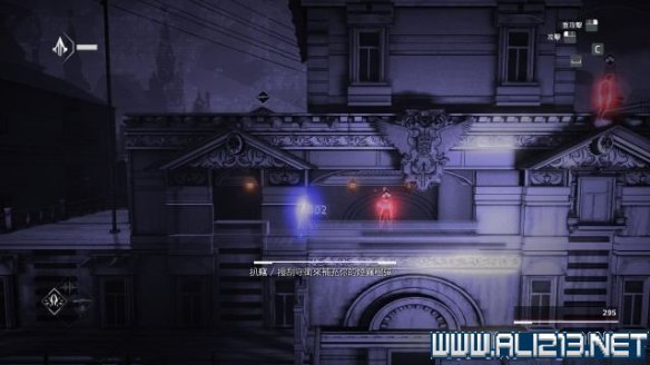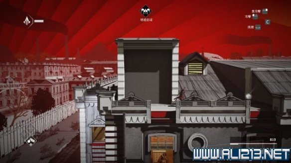 step6.使用钩绳飞跃至远方房屋的二层,借助楼道内的三个藏身处发动helix冲刺避开对视的两名守卫。