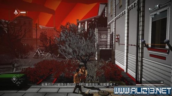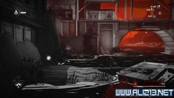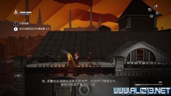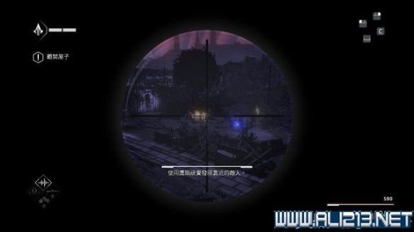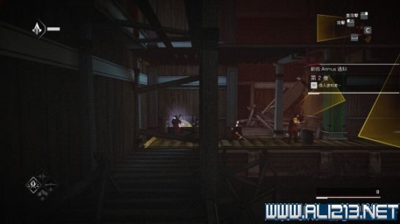 本关建议使用烟雾弹过后,走上通往远方的木梁,往右侧走去会找到本关唯一的鸟瞰点(同步点1/1)。