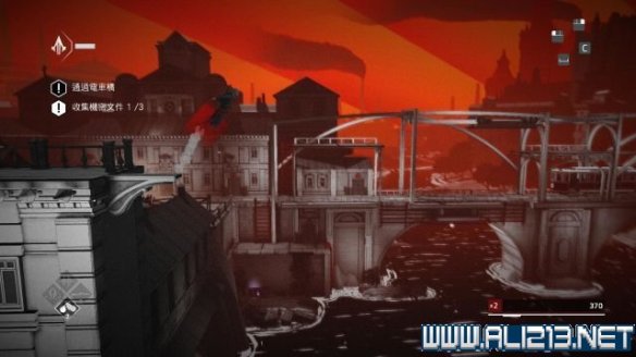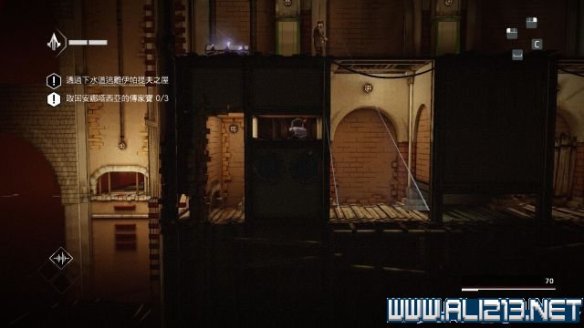 先往左侧的窟窿落到下层的下水道建筑内,爬到下层在柱子之间使用掩体移动可以躲过敌人的视野的同时拿到一颗animus碎片(碎片1/6)。