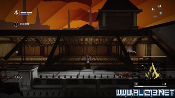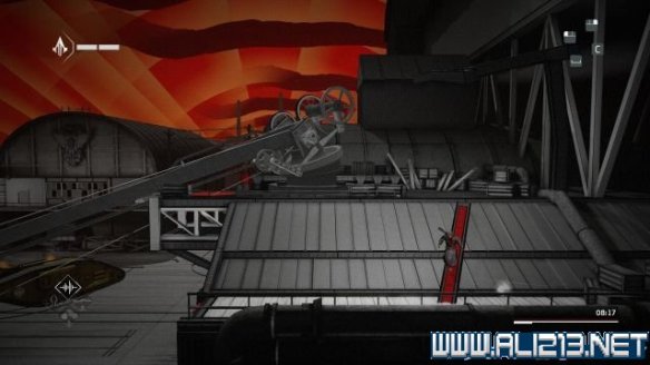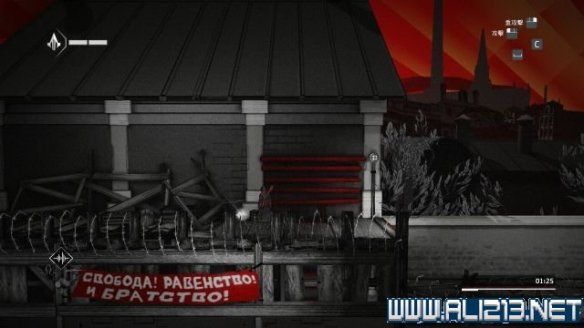 离开第一座工厂后,这时候暂时安全,爬上右侧的木架,以滑铲暗杀一名守卫。