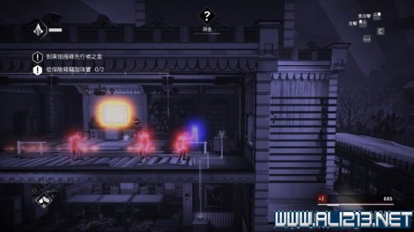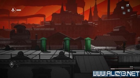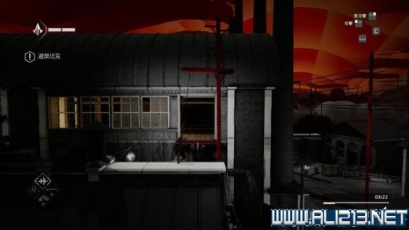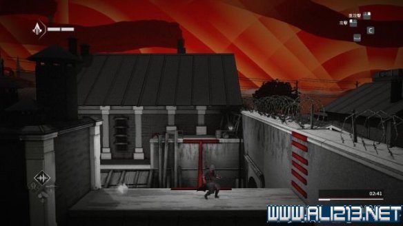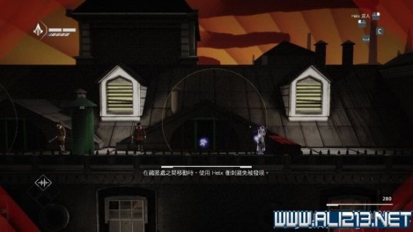step9.随后回到屋顶上继续往左侧前进,这里有两名观察型的守卫,先进入一个藏身处,然后发动helix冲刺从他们身边溜过。