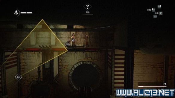 翻过水管后遇到左侧有两名守卫,电灯会间歇性熄灭,左侧的守卫视线会缩短,右侧的守卫直接连视野都失去,但对付他们要用简单粗暴的办法就是扔烟雾弹后直接通过。