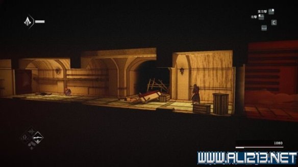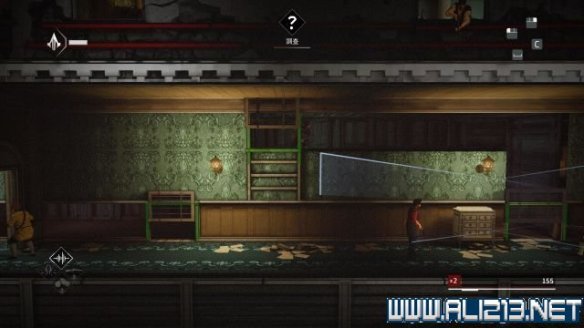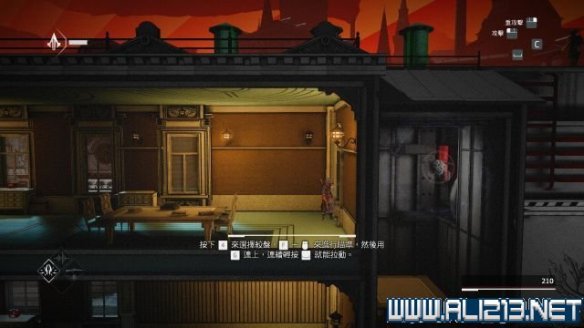 step8.先去到屋子右上侧的窗户,内进到二层,会发现一个宝物抽屉下有一个感应地雷,而左侧有一个熟睡的守卫,先发出一声口哨,然后从窗户翻到外墙再吹一次口哨,把守卫引诱过来后将其暗杀,就可以取得其身上的磁力钥匙。