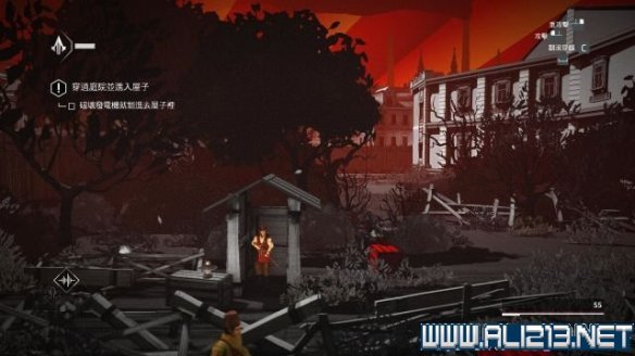 step6.利用左侧的草丛避开二层俯视的敌人,但如果他的视线落在奥列罗夫身上,如果一旦移动就会令到敌人察觉。