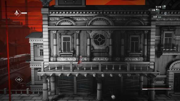 从梯子爬至上方,按空格翻出阳台栏杆,从红色杆子上方继续前进。