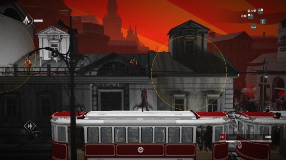 电车被拦截后,从电车上方的梯子向上爬,并向右移动爬上红色柱子,柱子上方有Animus。