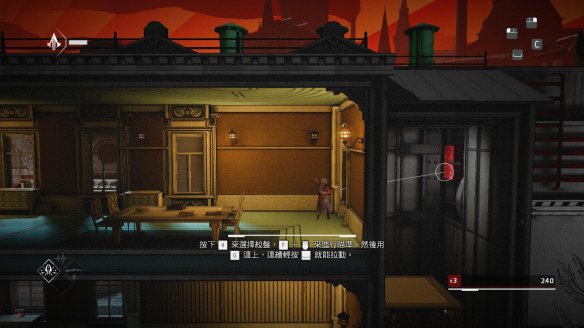 在第一个柜子上按W,通过电话声将下方1敌人朝左吸引,控制主角在上方朝右移动,按住C打开大门的锁,按4选择绞盘,F+移动鼠标标准电梯上方的红色区域,按G连接上后,松开G键,连续按空白键拉动开关,并升上电梯。