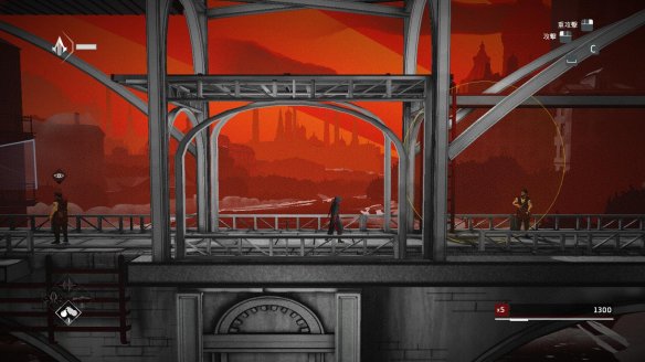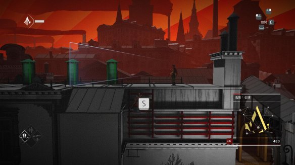 列车前方遇到两名交谈的敌人,按G使用绞盘登上天花板,从敌人上方朝右侧移动,登上梯子,按S切换平面。
