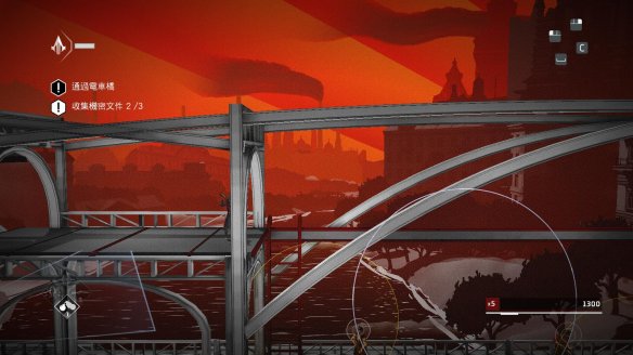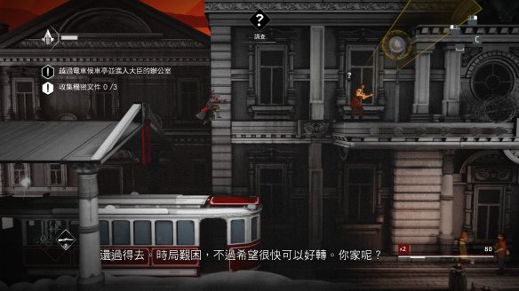 沿途一直前进,在切换平面处前方能收集到Animus碎片,按W切换平面后,左侧还能收集到Animus碎片,先不上电车,在右侧熟睡的敌人身上能偷到机密文件。