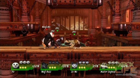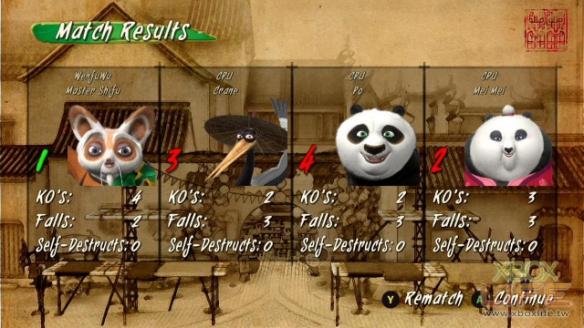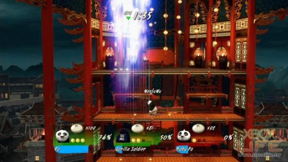 当然角色多达 20 名,加上每名角色间部份招式不同,平衡度上的问题也就并非完全没有,像主角阿波基本性能良好,但体积跟部份招式空隙就大了些,一遇到身形轻巧的角色就会有些困扰;而 Master Shifu(功夫大师)动作迅速,能轻松穿梭在各个场地,但手短脚短,遇到会用飞行道具的角色就得注意横轴上的动向。在变化性上,关卡中安排沉船强制出界、可以震倒人的钟等各种陷阱以及一定时间就会出现的道具,这些道具的运用有时也对胜败的影响很大,例如暂时性将皮肤硬化就不怕围殴、投掷后会形成黑洞吸人,甚至连原作出现的俏小龙跟快螳螂等角色都是可以利用的道具,说起来多少有点运气要素,如果不希望运气影响胜负的话,也可以在对战设定规则时进行更改。
